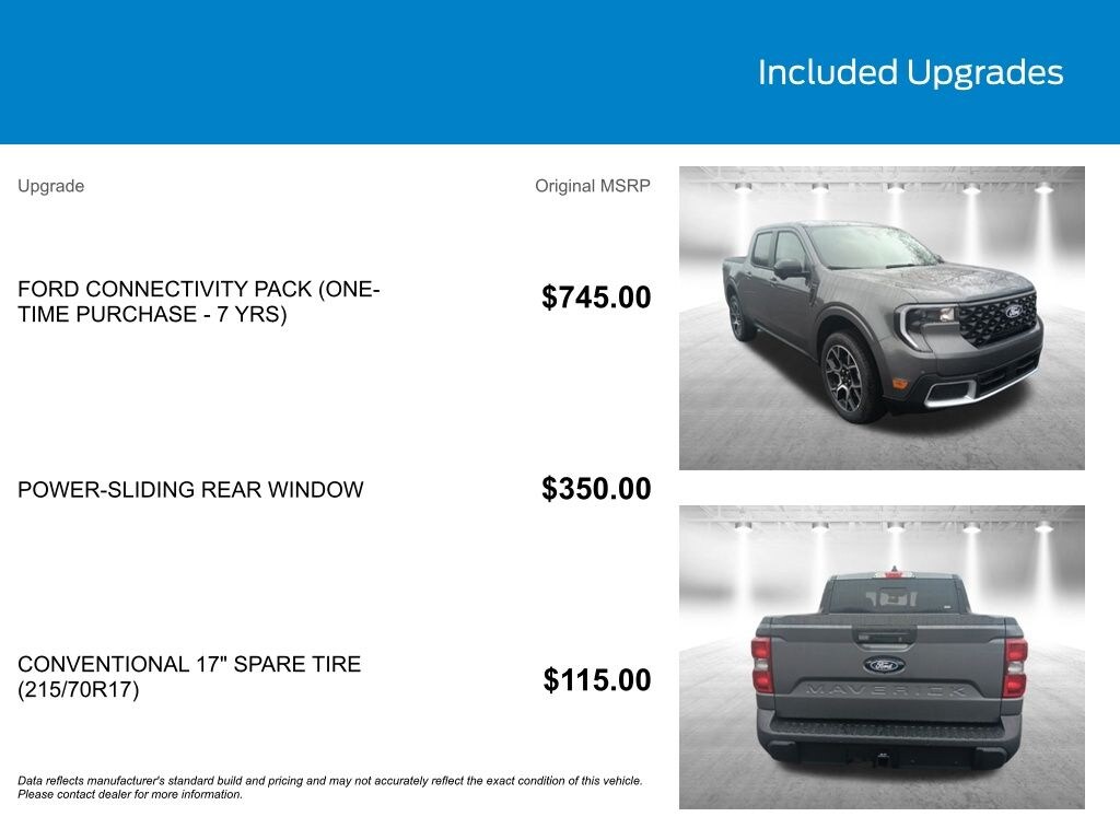 KEY FORD OF EXETER is proud to present you with another True Market Priced Vehicle. This 2026 Ford Maverick Lariat is loaded with the following Factory Options: 2.5L I-4 Hybrid Equipment Group 501A (2.91 Axle Ratio, ActiveX Trimmed Heated Front Bucket Seats, Radio: B&O Sound System by Bang and Olufsen, SiriusXM with 360L, SYNC 4 with Enhanced Voice Recognition, and Wheels: 19" Machined Aluminum Painted), Ford Connectivity Package (1-Year Included), Ford Connectivity Package (one-Time Purchase - 7 Years), Internet access capable: 5G Modem - Ford Connectivity Package, 2.5L I-4 Hybrid, 4-Wheel Disc Brakes, 8 Speakers, ABS brakes, Air Conditioning, Alloy wheels, AM/FM radio: SiriusXM with 360L, Apple CarPlay/Android Auto, Auto High-beam Headlights, Automatic temperature control, Brake assist, Bumpers: body-color, Compass, Delay-off headlights, Driver door bin, Driver vanity mirror, Dual front impact airbags, Dual front side impact airbags, Electronic Stability Control, Emergency communication system: SYNC 4 911 Assist, Exterior Parking Camera Rear, Four wheel independent suspension, Front anti-roll bar, Front Bucket Seats, Front Center Armrest, Front dual zone A/C, Front reading lights, Fully automatic headlights, Heated door mirrors, Heated front seats, Heated steering wheel, Illuminated entry, Knee airbag, Low tire pressure warning, Navigation system: Connected Navigation, Occupant sensing airbag, Outside temperature display, Overhead airbag, Overhead console, Panic alarm, Passenger door bin, Passenger vanity mirror, Power door mirrors, Power driver seat, Power steering, Power windows, Power-Sliding Rear Window, Radio data system, Rear anti-roll bar, Rear seat center armrest, Rear step bumper, Remote keyless entry, Security system, Speed control, Speed-sensing steering, Steering wheel mounted audio controls, Telescoping steering wheel, Tilt steering wheel, Traction control, and Trip computer!!