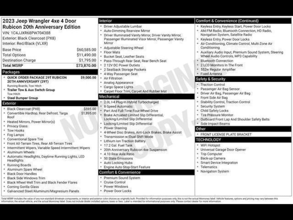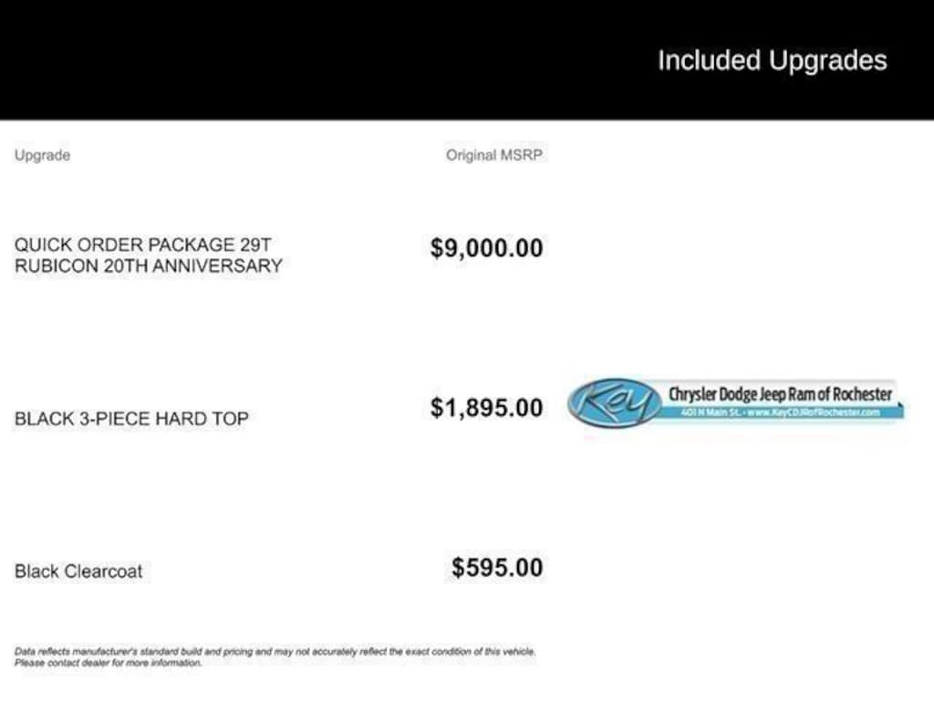 Key Chrysler Dodge Jeep Ram of Rochester is proud to present you with another True Market Priced Pre-Owned Vehicle. Transparent Pricing Of $ 32995 !! This 2023 Jeep Wrangler Rubicon 20th Anniversary Edition 4xe is loaded with the following Factory Options: 2.0L I4 DOHC, ABS brakes, Alloy wheels, Compass, Electronic Stability Control, Front dual zone A/C, Heated door mirrors, Illuminated entry, Low tire pressure warning, Navigation System, ParkView Rear Back-Up Camera, Passenger door bin, Remote keyless entry, and Traction control 2.0L I4 DOHC, ABS brakes, Alloy wheels, Compass, Electronic Stability Control, Front dual zone A/C, Heated door mirrors, Illuminated entry, Low tire pressure warning, Navigation System, ParkView Rear Back-Up Camera, Passenger door bin, Remote keyless entry, Traction control, 4-Wheel Disc Brakes, 4.10 Rear Axle Ratio, 9 Speakers, Air Conditioning, AM/FM radio: SiriusXM, Apple CarPlay/Android Auto, Auto-dimming Rear-View mirror, Automatic temperature control, Brake assist, Delay-off headlights, Driver door bin, Driver vanity mirror, Dual front impact airbags, Dual front side impact airbags, Emergency communication system: SiriusXM Guardian, Front anti-roll bar, Front Bucket Seats, Front Center Armrest w/Storage, Front fog lights, Front reading lights, Fully automatic headlights, Garage door transmitter, Integrated roll-over protection, Occupant sensing airbag, Outside temperature display, Panic alarm, Passenger vanity mirror, Performance Suspension, Power door mirrors, Power steering, Power windows, Premium Cloth Low-Back Bucket Seats, Radio data system, Radio: Uconnect 4C Nav w/8.4" Display, Rear anti-roll bar, Rear reading lights, Security system, Speed control, Split folding rear seat, Steering wheel mounted audio controls, Tachometer, Telescoping steering wheel, Tilt steering wheel, Trip computer, Variably intermittent wipers, Voltmeter, and Wheels: 17" x 7.5" Machined w/Black Pockets!!
