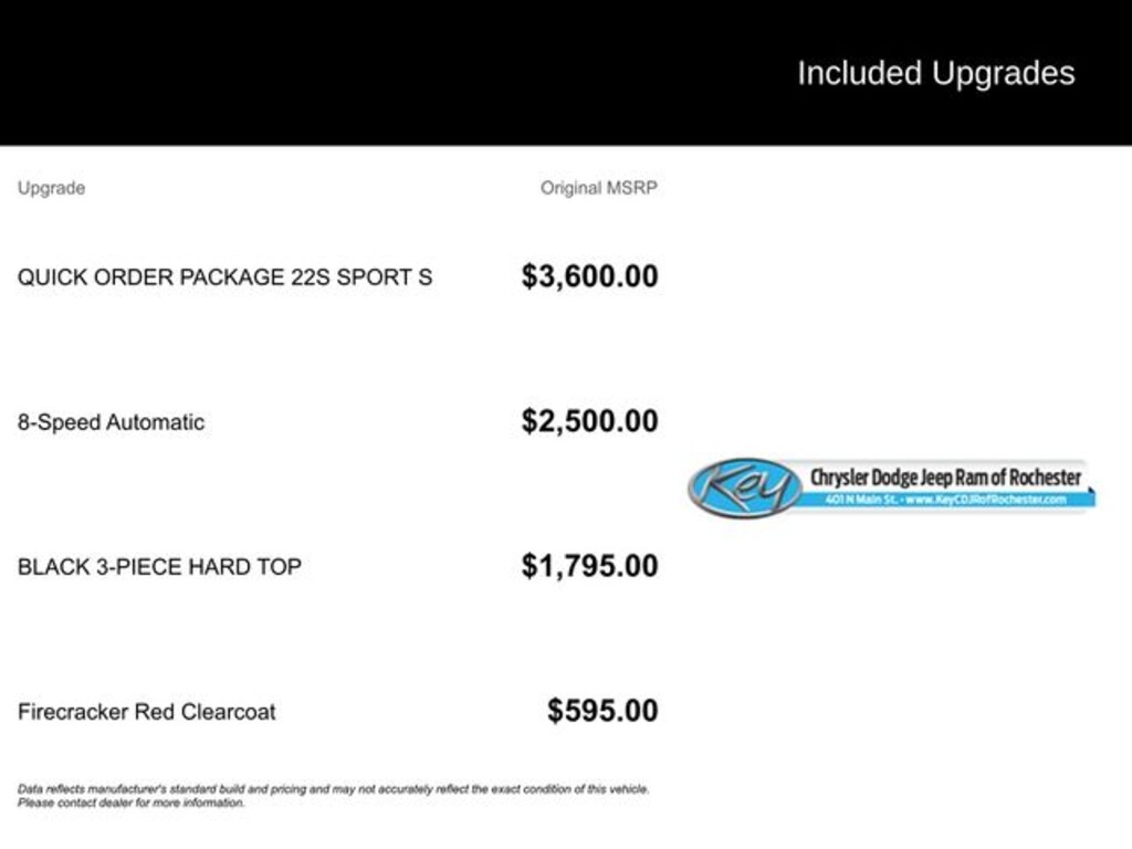Key Chrysler Dodge Jeep Ram of Rochester is proud to present you with another True Market Priced Pre-Owned Vehicle. Transparent Pricing Of $ 33999 !! This 2025 Jeep Wrangler Sport S is loaded with the following Factory Options: Quick Order Package 22S Sport S (Advanced Brake Assist, Automatic Headlamps, Corning Gorilla Glass, Deep Tint Sunscreen Windows, Enhanced Adaptive Cruise Control, Full Speed Forward Collision Warning Plus, Power Heated Mirrors, Premium Wrapped Steering Wheel, Security Alarm, Sun Visors w/Illuminated Vanity Mirrors, and Wheels: 17" x 7.5" Gray), 110 MPH Vehicle Max Speed Calibration, 3.45 Overall Top Gear Ratio, 4-Wheel Disc Brakes, 8 Speakers, ABS brakes, Air Conditioning, AM/FM radio: SiriusXM, Apple CarPlay/Android Auto, Aux Battery, Black 3-Piece Hard Top, Brake assist, Cloth Low-Back Bucket Seats, Compass, Delay-off headlights, Driver door bin, Driver vanity mirror, Dual front impact airbags, Dual front side impact airbags, Electronic Stability Control, Freedom Panel Storage Bag, Front anti-roll bar, Front Bucket Seats, Front Center Armrest w/Storage, Front fog lights, Front reading lights, Illuminated entry, Integrated roll-over protection, Low tire pressure warning, Non-Lock Fuel Cap w/o Discriminator, Normal Duty Suspension, Occupant sensing airbag, Outside temperature display, Overhead airbag, Panic alarm, ParkView Rear Back-Up Camera, Passenger door bin, Passenger vanity mirror, Power steering, Power windows, Radio data system, Radio: Uconnect 5 w/12.3" Display, Rear anti-roll bar, Rear reading lights, Rear Window Defroster, Rear Window Wiper/Washer, Remote keyless entry, Speed control, Split folding rear seat, Steering wheel mounted audio controls, Stop-Start Dual Battery System, Tachometer, Telescoping steering wheel, Tilt steering wheel, Traction control, Trip computer, Variably intermittent wipers, and Wheels: 17" x 7.5" Black Steel Styled!!