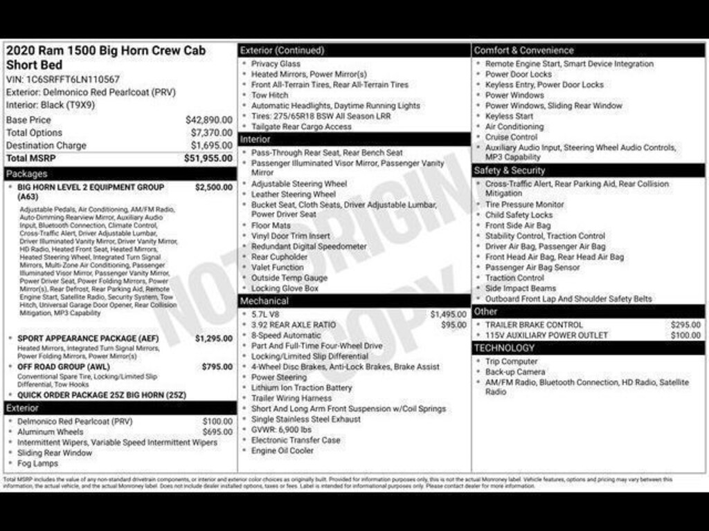 Key Chrysler Dodge Jeep Ram of Rochester is proud to present you with another True Market Priced Pre-Owned Vehicle. Transparent Pricing Of $ 28995 !! This 2020 Ram 1500 Big Horn/Lone Star is loaded with the following Factory Options: Big Horn Level 2 Equipment Group (115V Auxiliary Power Outlet, 115V Auxiliary Rear Power Outlet, 2 USB Full Function/Charge Only Media Hub, 2nd Row In Floor Storage Bins, 400W Inverter, Air Conditioning ATC w/Dual Zone Control, Auto-Dimming Rear-View Mirror, Big Horn IP Badge, Black Premium Power Mirrors, Class IV Receiver Hitch, Dampened Tailgate, Foam Bottle Insert (Door Trim Panel), Glove Box Lamp, Heated Front Seats, Heated Steering Wheel, ParkSense Front/Rear Park Assist w/Stop, Power 4-Way Driver Lumbar Adjust, Power 8-Way Driver Seat, Power Adjustable Pedals, Radio: Uconnect 4 w/8.4" Display, Rear Dome w/On/Off Switch Lamp, Rear Power Sliding Window, Rear Window Defroster, Security Alarm, SiriusXM Satellite Radio, Sun Visors w/Illuminated Vanity Mirrors, and Universal Garage Door Opener), Off Road Group (E-Locker Rear Axle, Front Extra HD Shock Absorbers, Hill Descent Control, Off Road Decals, Rear Extra HD Shock Absorbers, and Tow Hooks), Quick Order Package 25Z Big Horn (Big Horn Badge), Sport Appearance Package (3 Rear Seat Head Restraints, 4 Way Front Headrests, Black Interior Accents, Body Color Door Handles, Body Color Front Bumper, Body Color Premium Power Mirrors, Body Color Rear Bumper w/Step Pads, Bucket Seats, Deluxe Cloth Bucket Seats, Front Seat Back Map Pockets, Full Length Floor Console, Grille Surround 1 Body Color Texture 2 Black, Manual Adjust 4-Way Front Passenger Seat, Rear 60/40 Folding Seat, and Sport Decal), 4-Wheel Disc Brakes, 48V Belt Starter Generator, 6 Speakers, ABS brakes, Air Conditioning, Alloy wheels, AM/FM radio, Brake assist, Bumpers: chrome, Cloth Bench Seat, Compass, Delay-off headlights, Driver door bin, Dual front impact airbags, Dual front side impact airbags, Electronic Stability Control, Front anti-roll bar, Front Center Armrest w/Storage, Front fog lights, Front reading lights, Front wheel independent suspension, Fully automatic headlights, GPS Antenna Input, Heated door mirrors, Illuminated entry, Leather steering wheel, Low tire pressure warning, Occupant sensing airbag, Outside temperature display, Overhead airbag, Overhead console, Panic alarm, ParkView Rear Back-Up Camera, Passenger door bin, Passenger vanity mirror, Power door mirrors, Power steering, Power windows, Radio data system, Radio: Uconnect 3 w/5" Display, Rear anti-roll bar, Rear seat center armrest, Rear step bumper, Remote keyless entry, Remote Start System, Speed control, Split folding rear seat, Steering wheel mounted audio controls, Tachometer, Telescoping steering wheel, Tilt steering wheel, Traction control, Trailer Brake Control, Trip computer, Variably intermittent wipers, Voltmeter, Wheels: 18" x 8" Cast-Aluminum Painted, and Wheels: 18" x 8" Premium Paint Cast!!